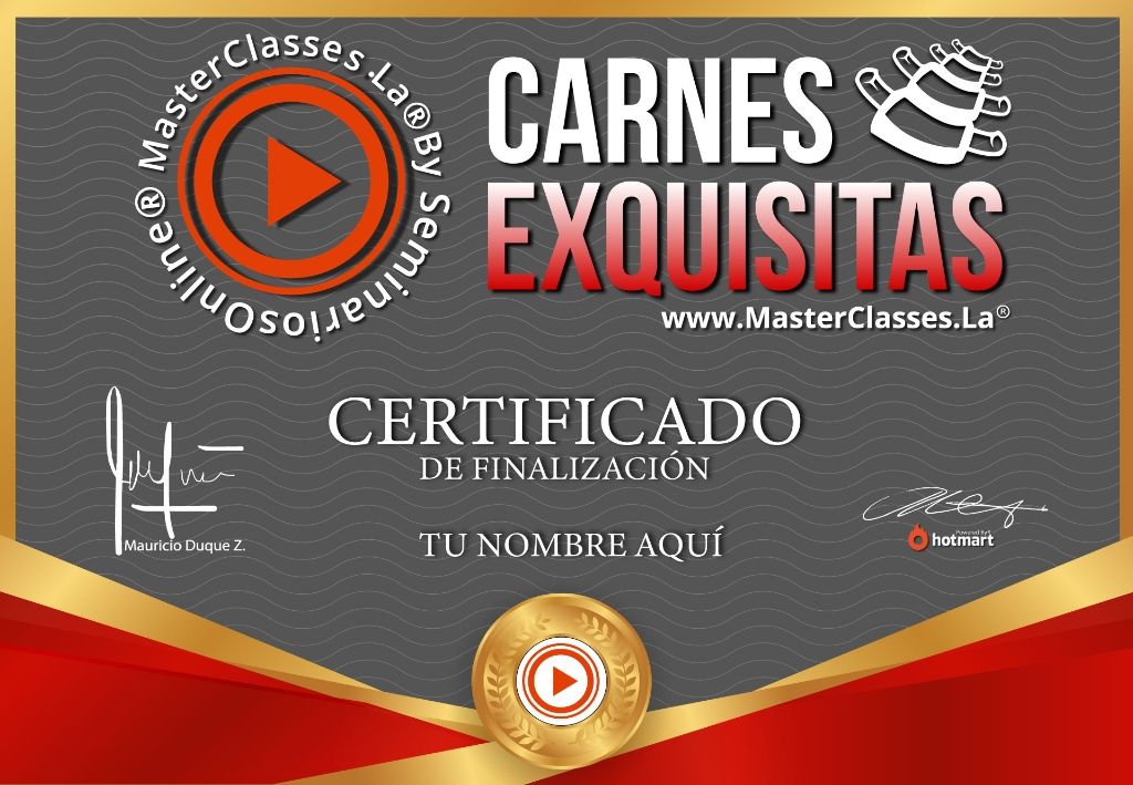 ¡Conviértete en un experto en carnes exquisitas con el curso MASTER CLASS CARNES EXQUISITAS! Aprenderás técnicas profesionales para cocinar diferentes cortes de carne y descubrirás las salsas, aderezos caseros, guarniciones y cócteles perfectos para complementar tus preparaciones. Obtén el certificado avalado por Hotmart y Seminarios Online. ¡No te pierdas esta oportunidad de sorprender a tus invitados y dejarlos hablando bien de ti!