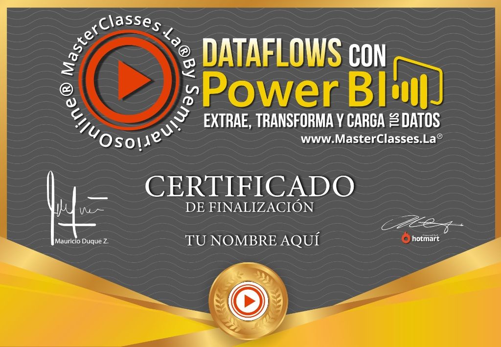 El curso “MasterClass DATAFLOWS DE POWER BI: EXTRAE, TRANSFORMA Y CARGA TUS DATOS” te enseñará de manera efectiva cómo administrar información utilizando Power BI. Aprenderás a consumir, transformar y cargar datos de manera correcta, disminuyendo los tiempos de actualización de tus informes. Además, adquirirás conocimientos sobre la creación de flujos de datos, funciones personalizadas en Power Query, áreas de trabajo y la capacidad Premium de Power BI. Con este curso, podrás transformar tus datos como nunca antes y desarrollar informes avanzados. Al finalizar, recibirás un certificado avalado por Hotmart y Seminarios Online. ¡No te pierdas esta oportunidad de mejorar tus habilidades en administración de información!