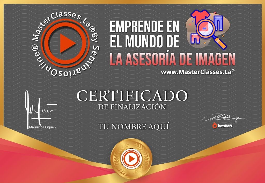 ¡Descubre el poder de la asesoría de imagen y genera altos ingresos! Con el MasterClass EMPRENDE EN EL MUNDO DE LA ASESORÍA DE IMAGEN, dominarás los fundamentos necesarios para iniciar tu propio proyecto en este lucrativo mercado. Aprenderás todo sobre estilos, siluetas, visagismo, colorimetría y mucho más. Además, contarás con el apoyo y retroalimentación de Yamila Farignon, creadora del curso. ¡No te pierdas esta oportunidad y accede al certificado avalado por Hotmart y Seminarios Online!