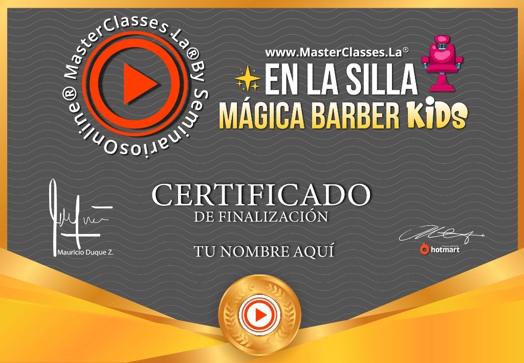 ¡Descubre el Master Class EN LA SILLA MÁGICA BARBER KIDS y aprende a crear tu propia barbería para niños! Aprenderás las bases del corte de cabello infantil, las técnicas para manejar un negocio exitoso y cómo generar un nicho de mercado altamente rentable. Conocerás las herramientas de barbería más importantes, aprenderás sobre el servicio al cliente y la ética profesional. Además, aplicarás técnicas de corte de cabello siguiendo las últimas tendencias en estética facial para niños. Aprenderás los pilares fundamentales del Marketing digital para atraer clientes y crear ofertas irresistibles. ¡Obtén tu certificado avalado por Hotmart y Seminarios Online! No pierdas esta oportunidad de emprender en el mundo de la barbería infantil.