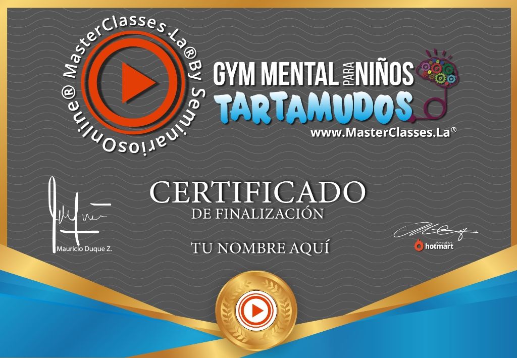 ¿Quieres ayudar a un niño tartamudo a convertirse en un gran orador? Con el masterclass GYM MENTAL PARA NIÑOS TARTAMUDOS podrás hacer terapias a niños con disfemia y ayudarles a hablar con fluidez, recuperar la autoestima y normalizar las interacciones con otras personas. En menos de 21 días, lograrás que tu hijo hable con fluidez y entenderás cómo funciona su cerebro, sus necesidades y cómo optimizar la técnica de GYM MENTAL para niños tartamudos. Aprenderás a construir un tablero de instrucciones personalizado y a enseñar a tu hijo mediante el juego. Además, potenciarás su desarrollo accediendo directamente a su inconsciente y registrarás su evolución día a día. ¡Obtén el certificado avalado por Hotmart y Seminarios Online!