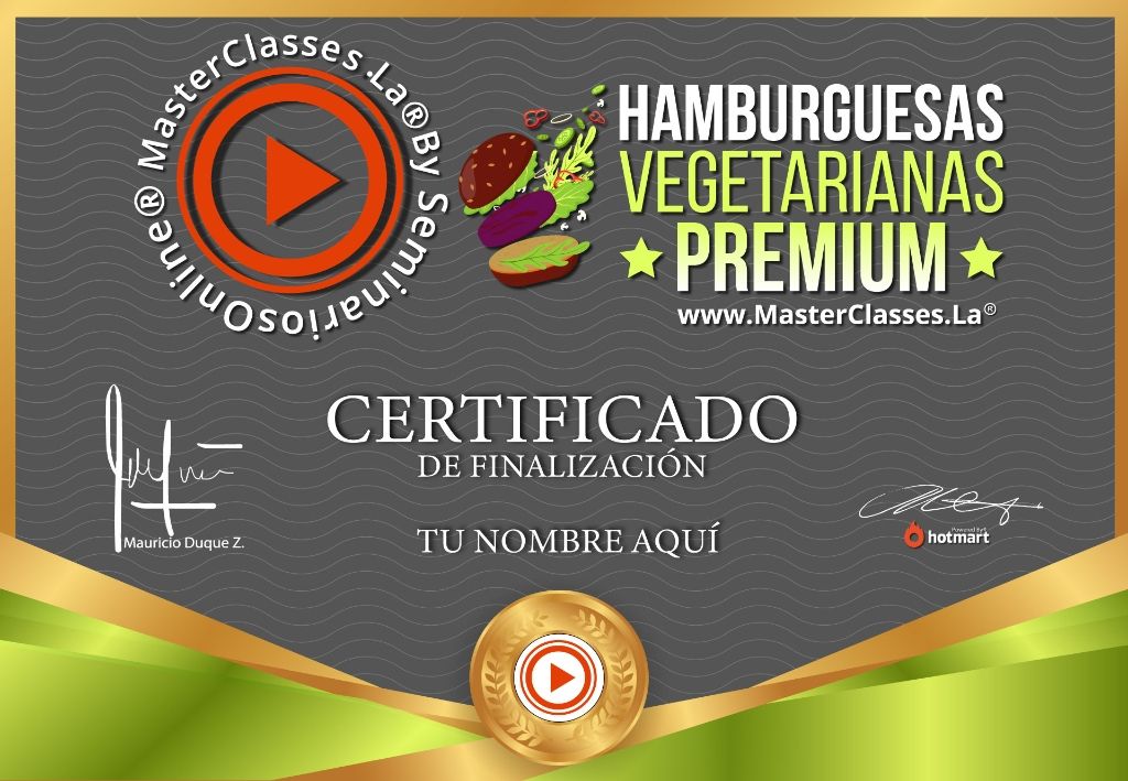 ¿Te encantan las hamburguesas pero llevas una dieta vegetariana? Aprende a elaborar deliciosas hamburguesas vegetarianas libres de proteína animal con el MasterClass HAMBURGUESAS VEGETARIANAS PREMIUM. Descubre todos los nutrientes y macronutrientes que te brindan estas hamburguesas, conoce alternativas al huevo, pan y queso para dietas veganas, y complementa tus hamburguesas con salsas premium 100% naturales. Cambia tus hábitos alimenticios, mejora tu salud y emprende tu propio negocio de hamburguesas vegetarianas premium. Accede al certificado avalado por Hotmart y Seminarios Online. ¡Aprende de forma rápida y sencilla con este curso!