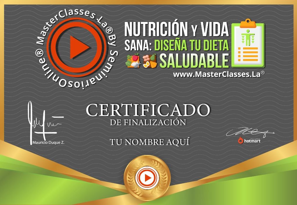 ¡Obtén tu certificado en el MasterClass NUTRICIÓN Y VIDA SANA: DISEÑA TU DIETA SALUDABLE! Aprende a diseñar tu propia dieta equilibrada, contar calorías o porciones, y crear planes de alimentación para mantener, bajar o subir de peso. Descubre los componentes nutricionales necesarios para mantener una buena salud y lograr tus objetivos. Reconoce tu composición corporal saludable y aprende los hábitos necesarios para una vida sana. ¡No te pierdas esta oportunidad de mejorar tu salud y obtener el certificado avalado por Hotmart y Seminarios Online!