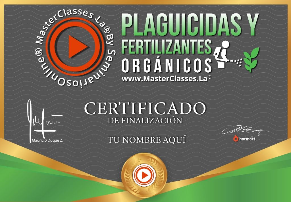 ¿Quieres aprender a elaborar tus propios fertilizantes y plaguicidas naturales? Con el masterclass PLAGUICIDAS Y FERTILIZANTES ORGÁNICOS, podrás preparar desde cero los más potentes plaguicidas con insumos que tienes en casa. Aprenderás a identificar y combatir las plagas más comunes en tu jardín o huerta, entenderás por qué funcionan tan bien los fertilizantes orgánicos y descubrirás nuestro tip secreto para prescindir de plaguicidas en el futuro. Al finalizar, recibirás un certificado avalado por Hotmart y Seminarios Online. ¡No te pierdas esta oportunidad de cuidar tus plantas de forma natural!