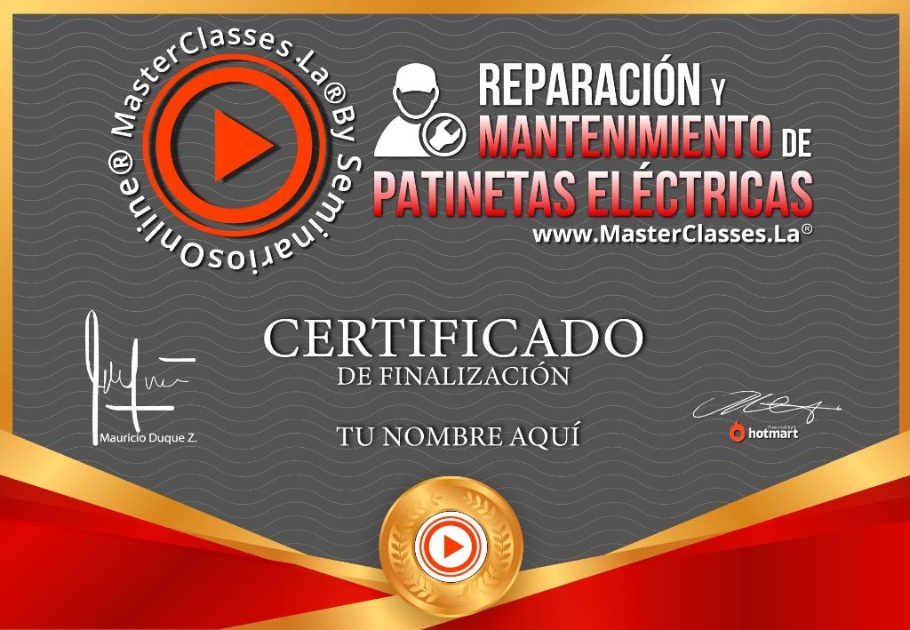 ¡Mejora tu movilidad y aprende a reparar patinetas eléctricas con el MasterClass de Reparación y Mantenimiento de Patinetas Eléctricas! Aprenderás sobre los diferentes tipos de patinetas, cómo armar y desarmarlas, las herramientas necesarias, las partes que las componen, cómo diagnosticar y reparar posibles daños eléctricos, y mucho más. Además, recibirás un certificado avalado por Hotmart y Seminarios Online. No pierdas la oportunidad de adquirir este conocimiento y mejorar tus habilidades en este medio de transporte tan popular. ¡Inscríbete ahora!