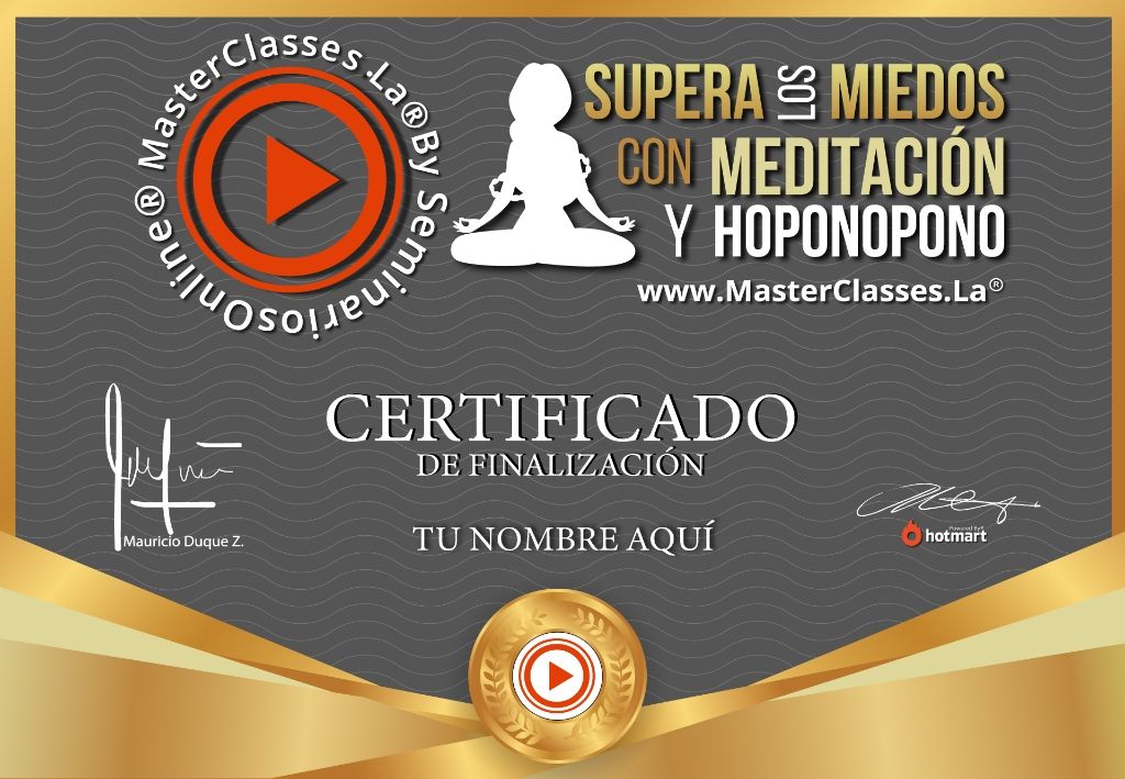 ¡Supera tus miedos y vive una vida en calma con el MásterClass de Meditación y Hoponopono! Aprende técnicas milenarias para eliminar la ansiedad, los ataques de pánico y los miedos recurrentes. Reprograma tu mente, descubre y supera tus memorias de dolor, y toma el control de tu realidad. Obtén el certificado avalado por Hotmart y Seminarios Online. ¡No te pierdas esta oportunidad de transformar tu vida!